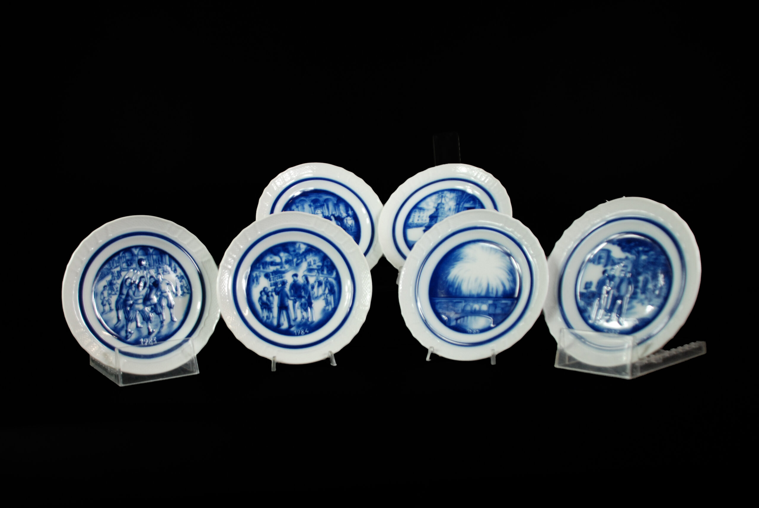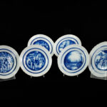 Collezione di 4 piatti dell’anno disegnati da Bino Bini per Richard Ginori con soggetto “Feste Fiorentine”. Ogni piatto (Ø 20,5cm) è stato prodotto in numero limitato con tecnica del bassorilievo dipinto a mano “a gran fuoco” in blu sottosmalto. La collezione comprende il 1981 con soggetto Le Rificolone, 1982 Lo Scoppio del Carro, 1983 Il Calcio in Costume, 1984 La Festa del Grillo.