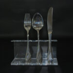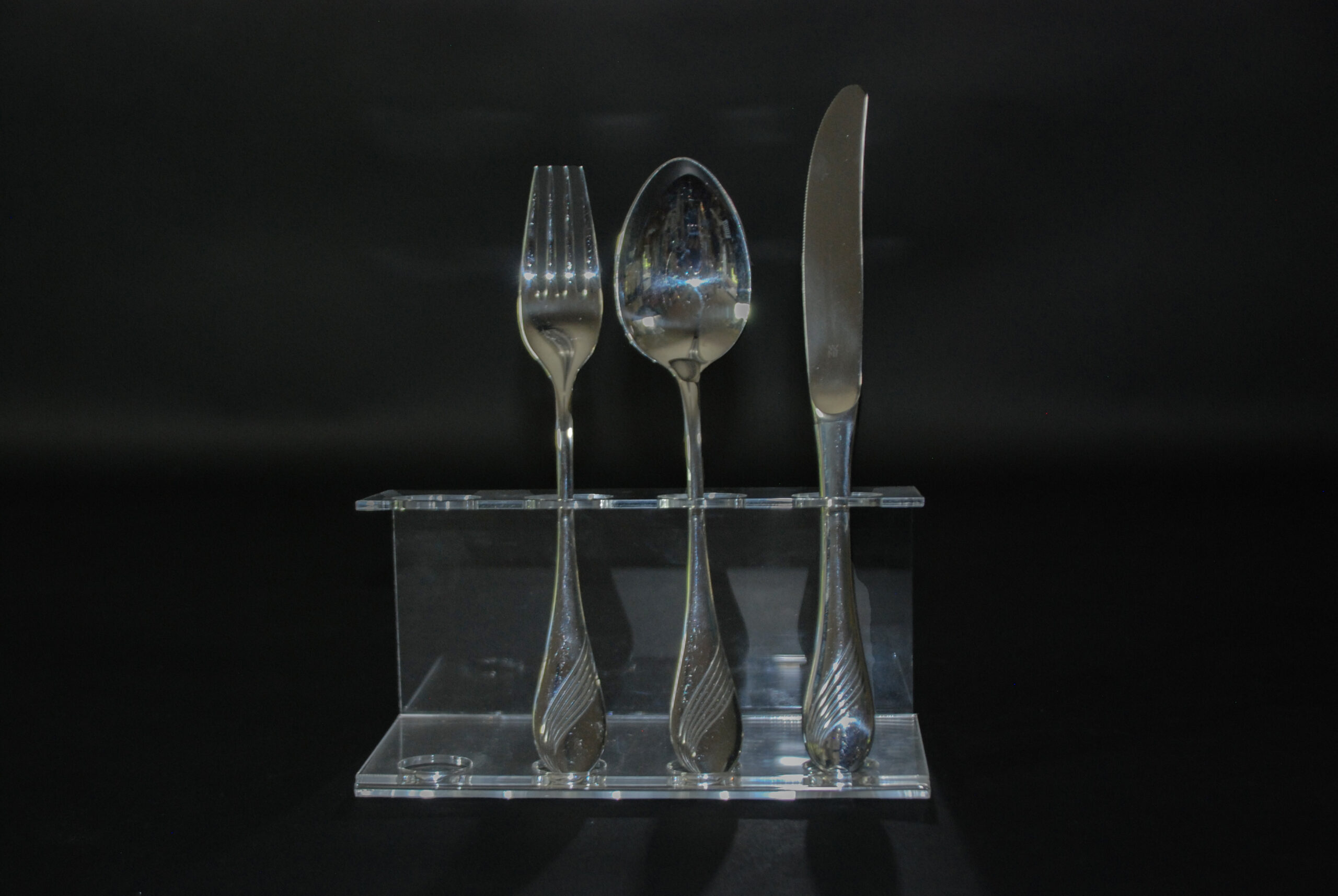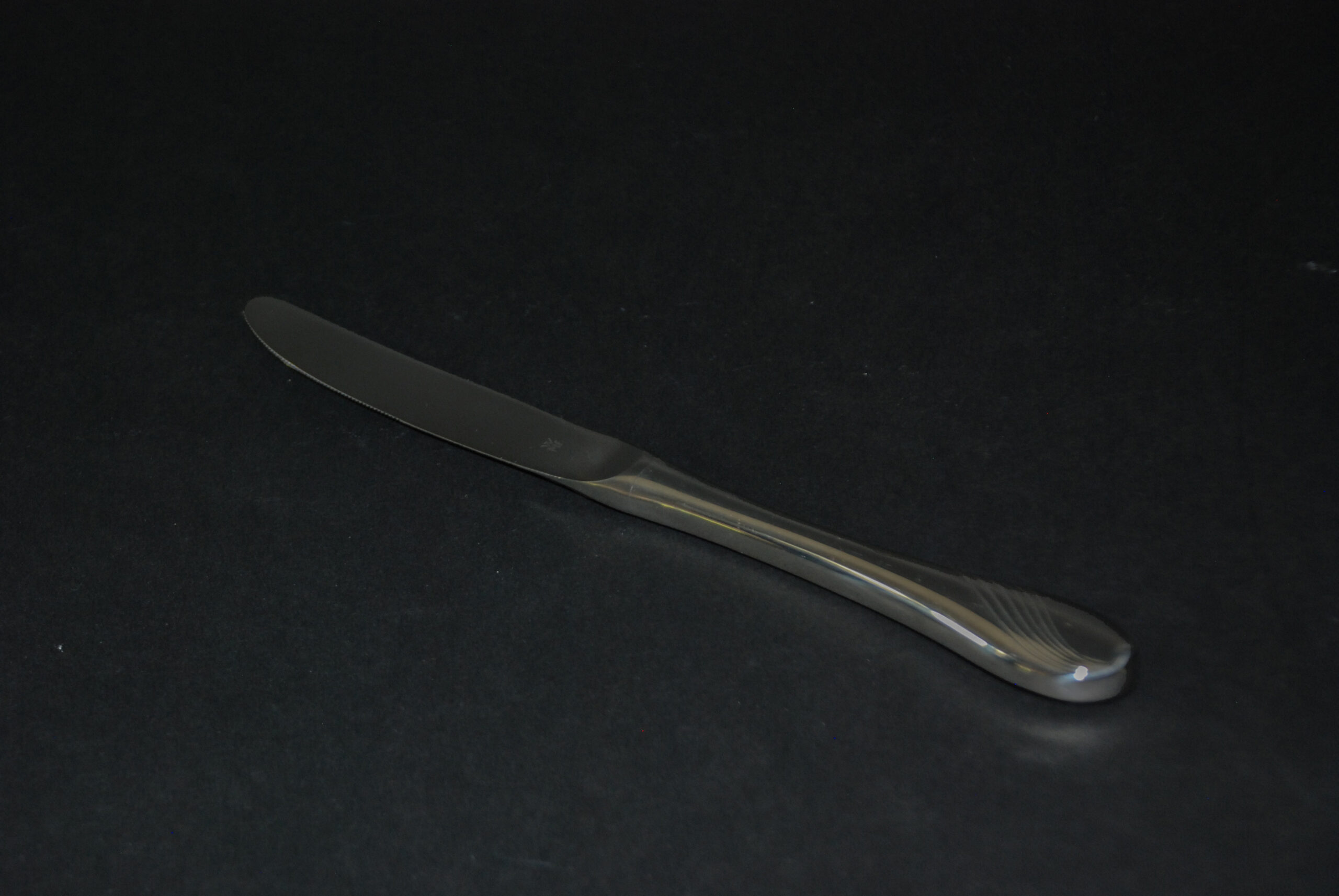Elegante set di 3 posate in acciaio cromargan WMF lucido con manico stondati, è caratterizzato da un decoro “a onda” che si avvolge lungo il manico ed è lavorato a rilievo.